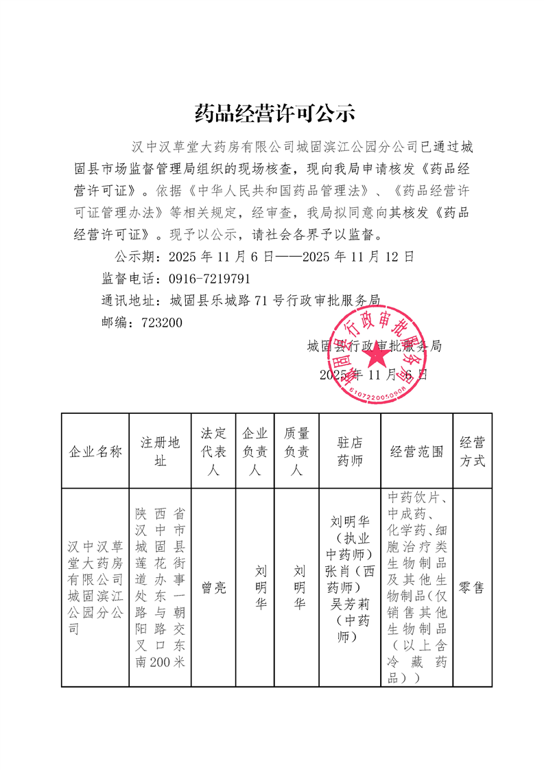 漢中漢草堂大藥房有限公司城固濱江公園分公司藥品經營許可公示
