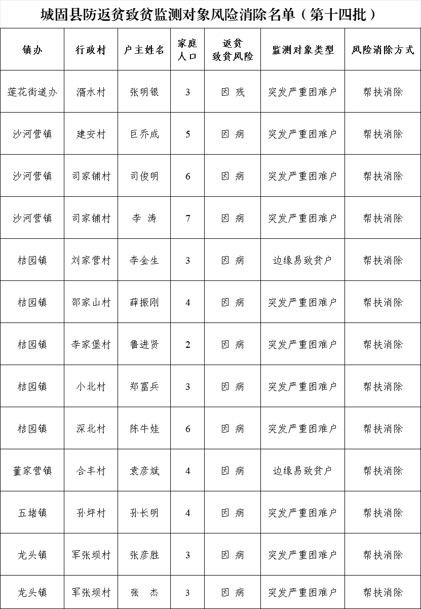 按照《城固縣健全防止返貧動態監測和幫扶機制實施細則》要求,經入戶核實、村級評議、鎮(街道)審核、縣級審定,最終確定防返貧致貧監測戶風險消除13戶53人,現將名單予以公告。