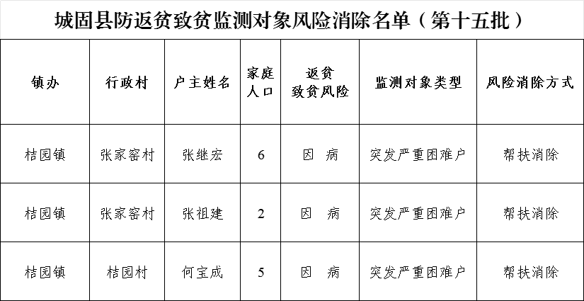 按照《城固縣健全防止返貧動態(tài)監(jiān)測和幫扶機制實施細則》要求,經(jīng)入戶核實、村級評議、鎮(zhèn)(街道)審核、縣級審定,最終確定防返貧致貧監(jiān)測戶風險消除3戶13人,現(xiàn)將名單予以公告。