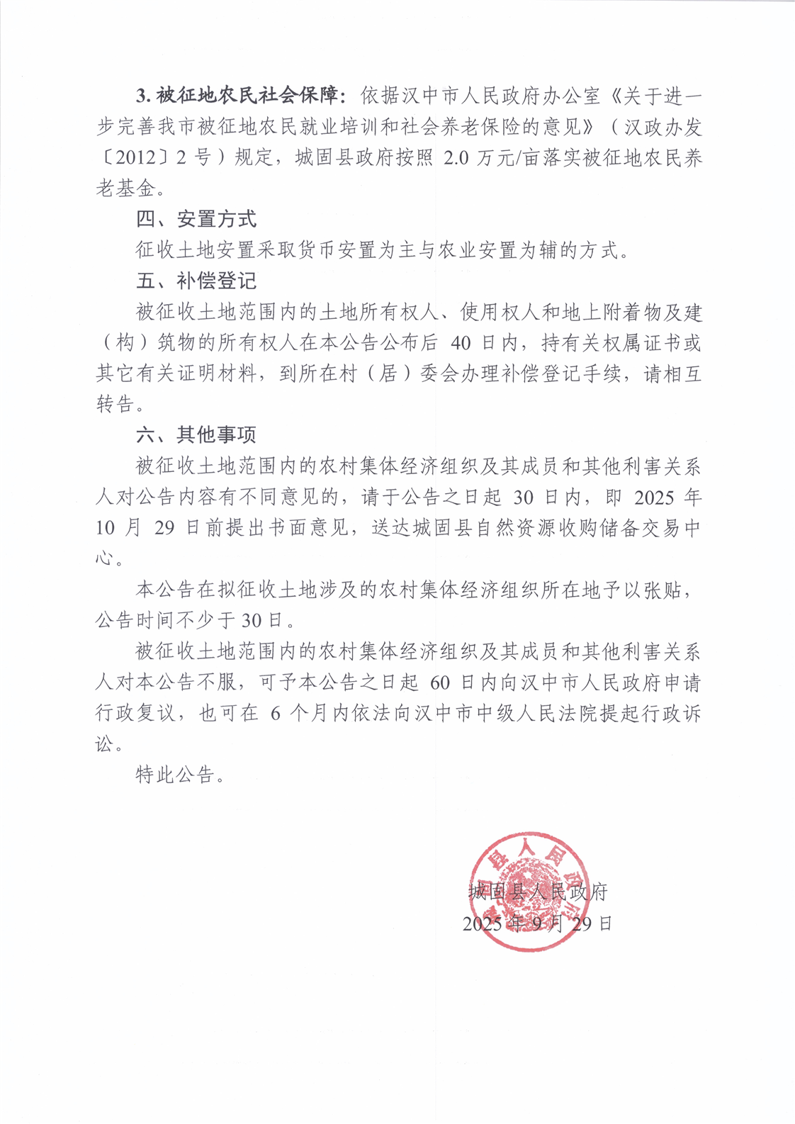 城固縣人民政府擬征收土地征地補償安置方案公告(30號)