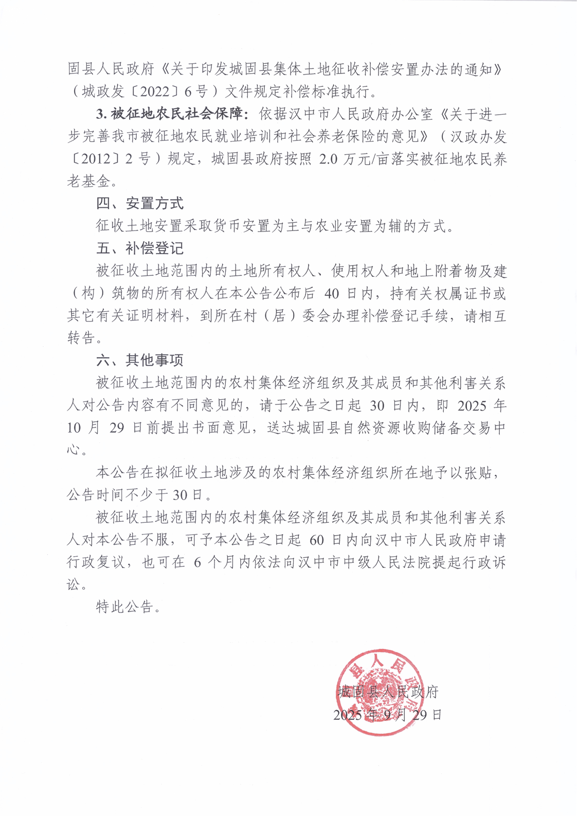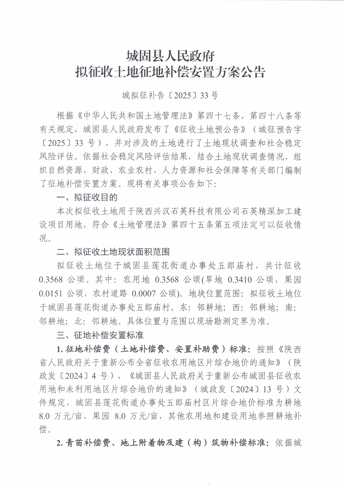 城固縣人民政府擬征收土地征地補償安置方案公告(33號)