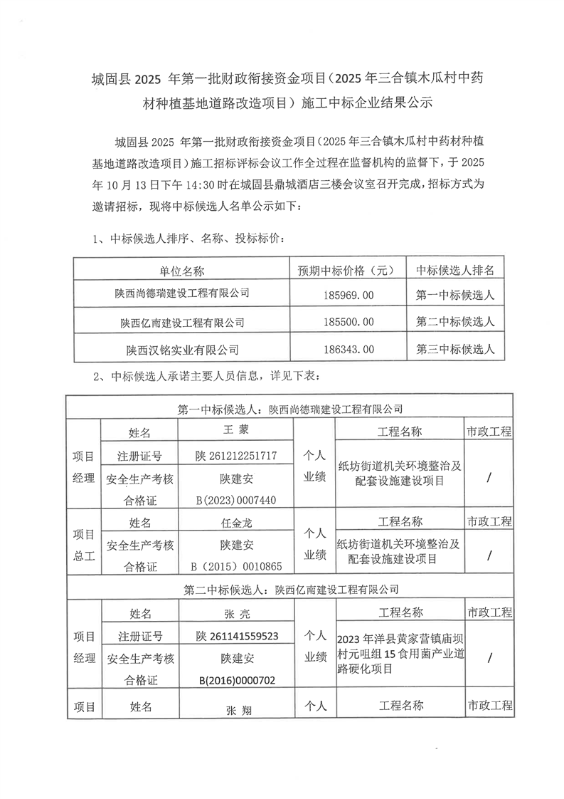 城固縣2025年三合鎮木瓜村中藥材種植基地道路改造項目施工中標企業結果公示