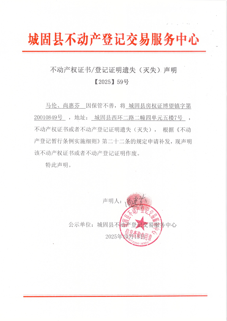 城固縣不動(dòng)產(chǎn)登記交易服務(wù)中心遺失(滅失)聲明 【2025】59號(hào)