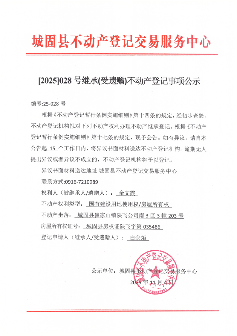 城固縣不動產登記交易服務中心繼承(受遺贈)不動產登記事項公示(028號)