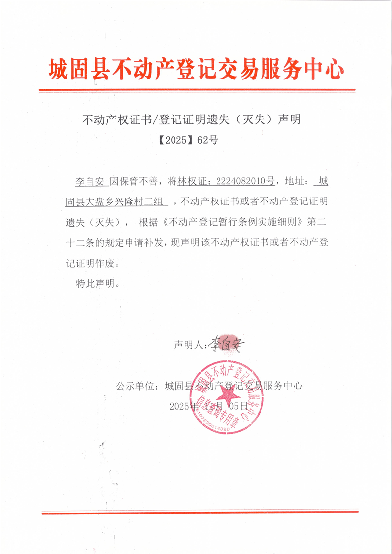 城固縣不動產登記交易服務中心遺失(滅失)聲明 【2025】62號